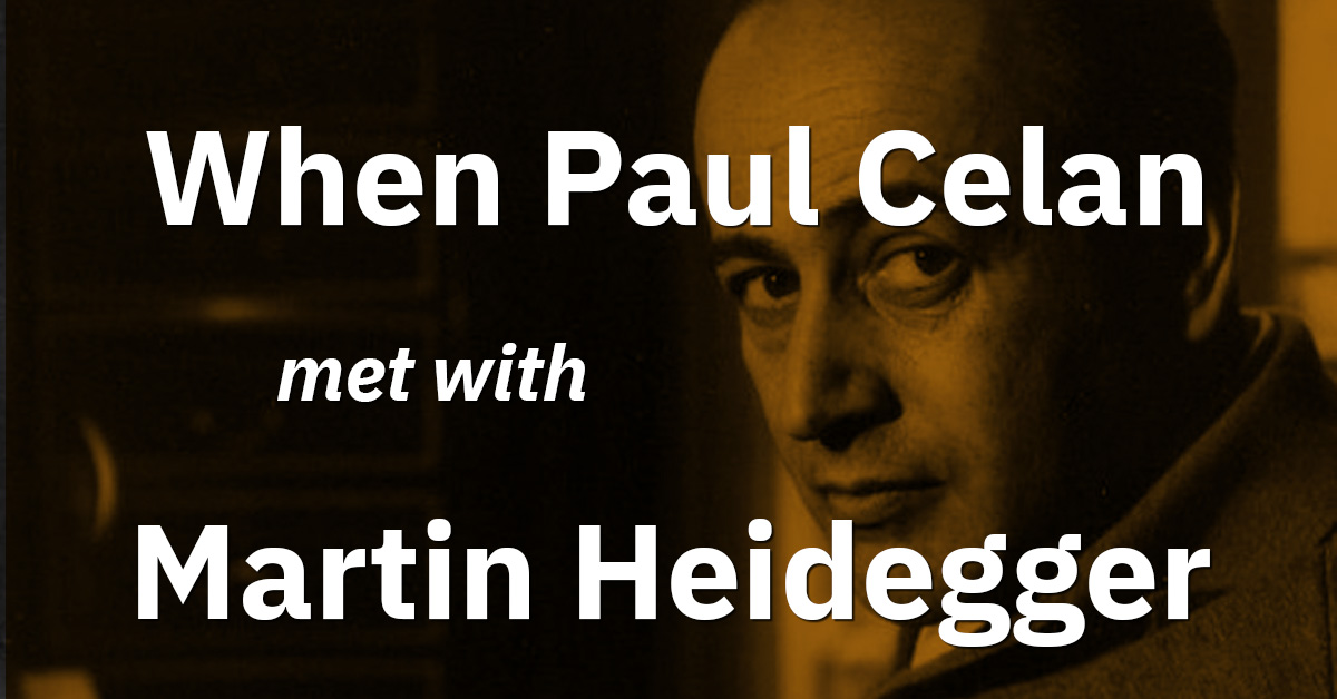Paul Celan (1920-1970) was a renowned German-language poet of Jewish origin. Both his parents died in an internment camp during World War II. Celan himself was imprisoned in a work camp until his liberation in 1944. Heidegger on the other hand had joined the Nazi Party in 1933. Celan had read Being and Time, and Heidegger was appreciative of Celan’s poetry. The two men met only once, over a period of two days. First in public, on July 24, 1967, when Celan delivered a lecture at the University of Freiburg, and in private on the next day when Celan visited Heidegger at his “hut”, in Todtnauberg. The exact content of what was said –and not said– during this private meeting remains unknown. The meeting itself, as well as a poem Celan subsequently wrote about it (“Todtnauberg” dated from August 1st, 1967) , were and still are subject to many discussions.